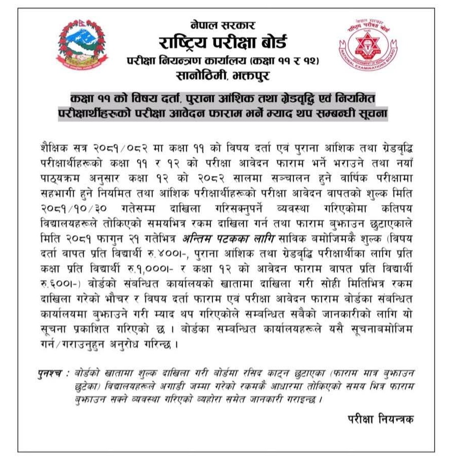 बोर्डले शैक्षिक सत्र २०८१ / ०८२ मा कक्षा ११ को विषय दर्ता एवं पुराना आंशिक तथा ग्रेडवृद्धि परीक्षार्थीहरूको कक्षा ११ र १२ को परीक्षा आवेदन फाराम भर्ने भराउने तथा नयाँ पाठ्यक्रम अनुसार कक्षा १२ को २०८२ सालमा सञ्चालन हुने वार्षिक परीक्षामा सहभागी हुने नियमित तथा आंशिक परीक्षार्थीहरूको परीक्षा आवेदन फारम भर्ने म्याद २०८१ माघ ३० गतेसम्म रहेकोमा २०८१ फागुन २१ गतेसम्म थप गरेको हो ।